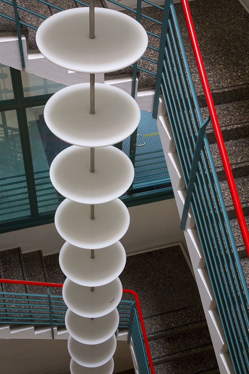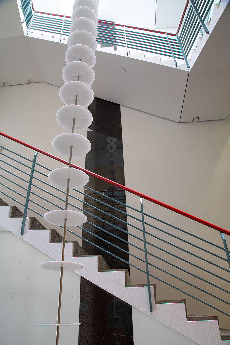 Länge und Positionierung des Objektes im Treppen-Luftraum sind so gewählt, dass sowohl vom untersten (1. UG) wie vom obersten (3. OG) Podest aus in der optimalen Verkürzung die Ausgangslage – die Kugel – wieder erkennbar wird.
