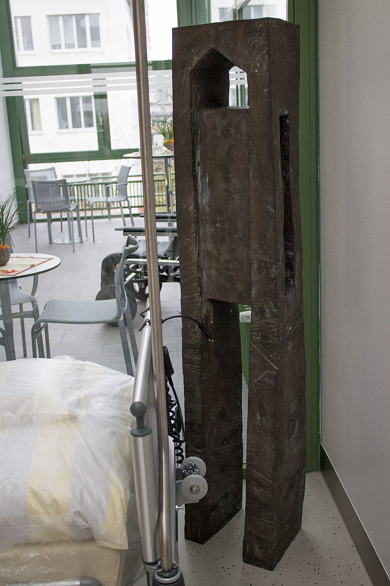 Die Stele ist schräg zur Ecke platziert. Archaisch einfach, erinnert sie an ein Mahnmal aus einer anderen Zeit. Die Höhe passt zur menschlichen Figur, die Form lässt an eine Architektur, wie ein japanisches Teehaus zum Beispiel, denken. Dort wo der Kopf wäre ist ein Durchblick. Der Leerraum wird zum Zeitraum. Der Eingang wird zum Durchgang.