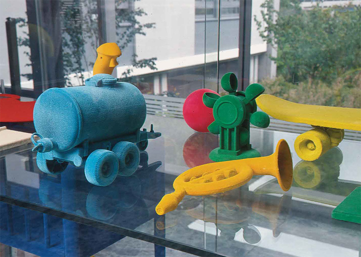 Objekte (geschäumte Spielsachen) in einer Vitrine