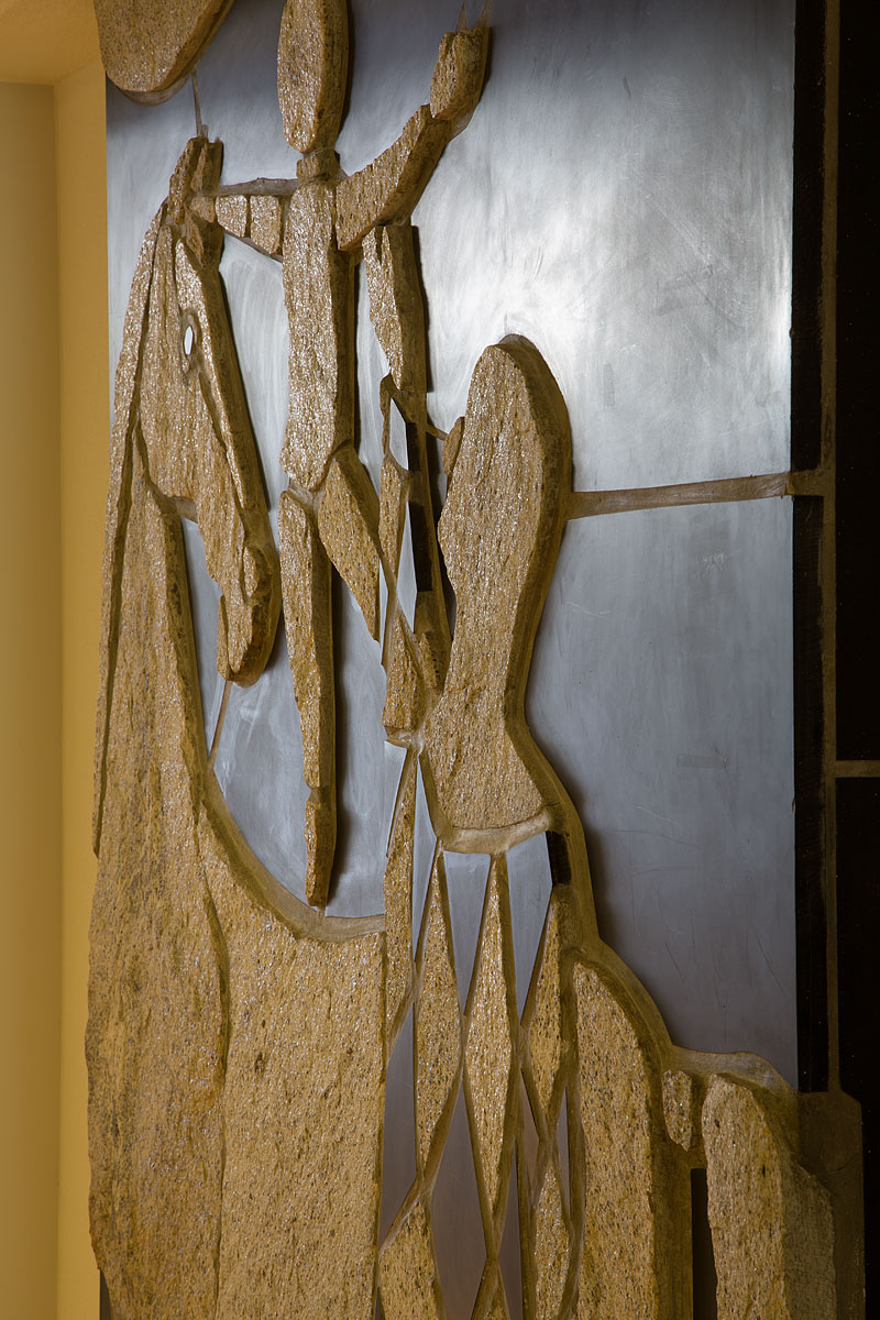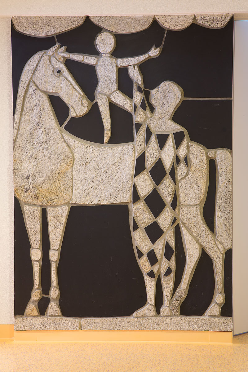 Ein Pferd mit einem kleinen Reiter und einem Harlekin sind in einer Dreieck-Komposition und in der ungewöhlichen Intarsia-Technik von skulptiertem Granit und Schiefer in die Wand gemeisselt. Das Steinrelief ist unverrückbar mit der Architektur verbunden. Es handelt sich um ein ausdruckstarkes Kunst-und-Bau-Werk, das während des Baus schon geplant und im Gebäude fest integriert wurde. Die unterschiedliche materielle Wirkung entfaltet sich besonders schön aus der Über-Eck-Perspektive. Dabei beieinflusst die zirka 15 cm dicke Stirnseite der Platte massgeblich die räumliche Wirkung des Werkes.