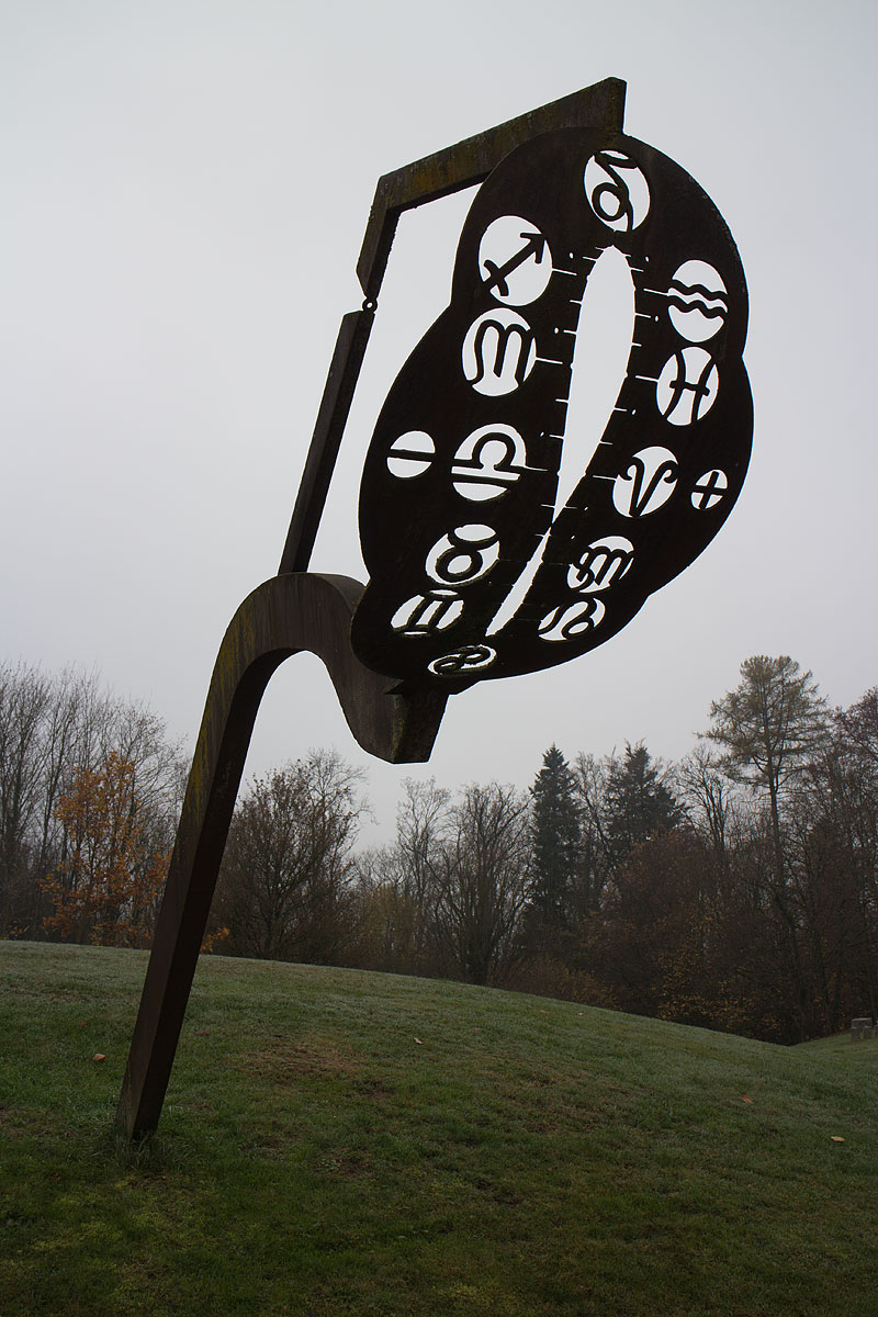 Am oberen Ende des Schattenwerfers schwebt eine Scheibe mit Monats- bzw.Tierkreiszeicheneinteilung, durch die die exakte Zeit datumsunabhängig ablesbar wird. Der Schatten bzw. der durch die Platte scheinende Lichtpunkt des zutreffenden Monats auf der in den Betonbelag eingefrästen Stundenmarkierung ist jeweils massgebend.