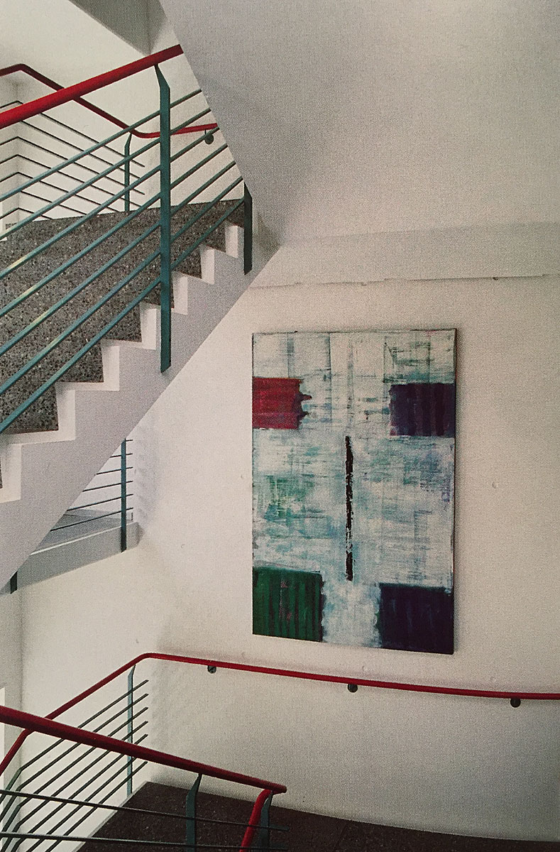 Das abstrakte Gemälde ist im Treppenhaus Ost platziert, wird also in Bewegung wahrgenommen. Vier farbige Flächen rahmen eine weissliche, kreuzförmige Fläche. Sie wird von einer schwarzen vertikalen Linie zentral durchzogen. Die Maltechnik mit Unschärfen und Verzerrungen erinnert an das Störbild bei einem alten Fernseher.