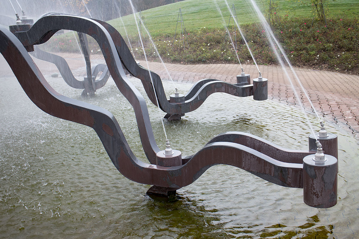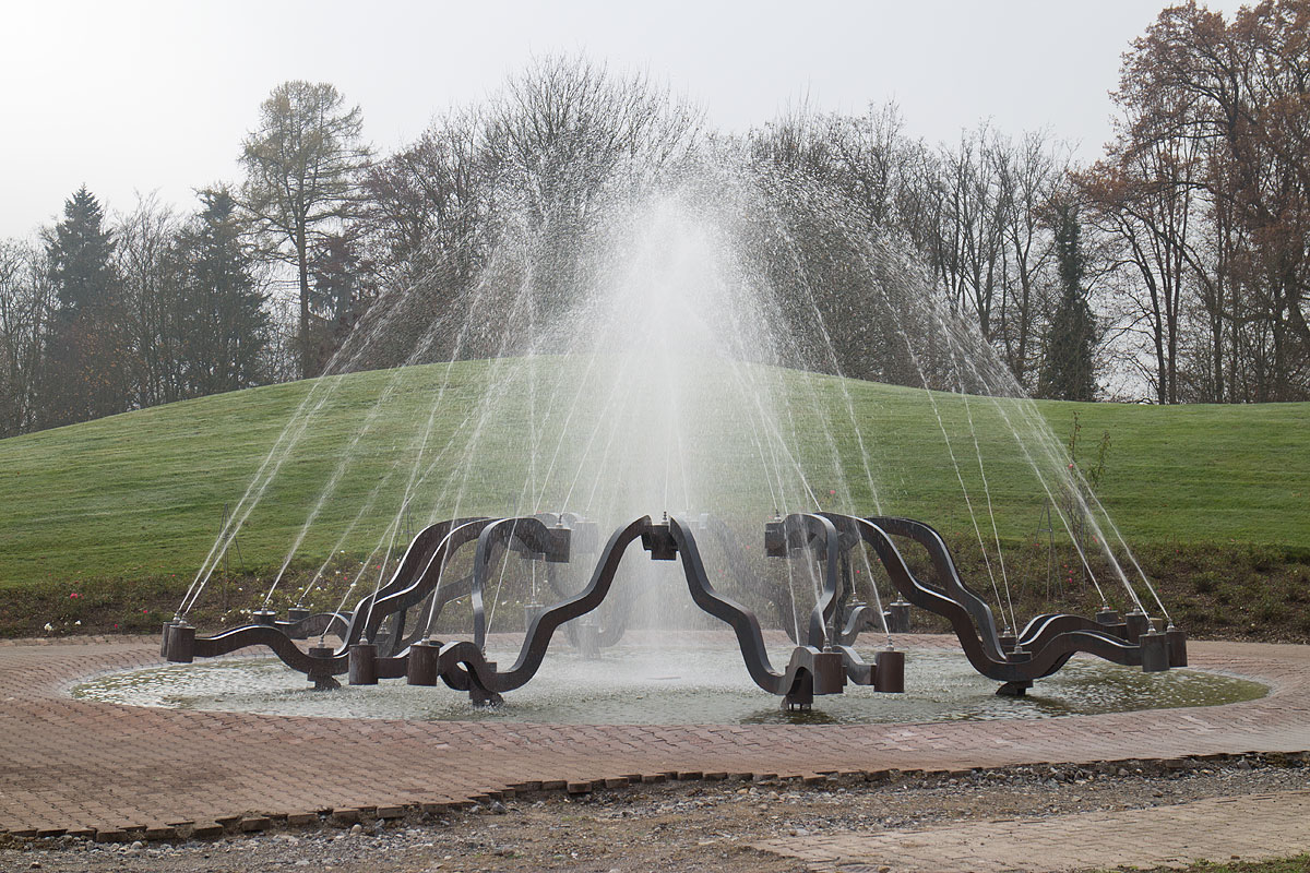 In der verlängerten Sonnenaufgangslinie des kürzesten Tages der Sonnenuhr ist die Wasserkapelle in einem Wasserbecken situiert und steht für «Die Geburt». Eine organisch wachsende, achtarmige Stahlkonstruktion sprüht aus 32 Düsen Wasser, welches die Form einer sich öffnenden Knospe umschreibt. Von diesem runden Becken fliesst das Wasser in den grossen Weiher, dessen Sündrand von Ost bis West die Winterlinie der Sonnenuhr markiert (Schattenlinie des kürzesten Tages). Die Hochsommerschattenlinie (Sonnenwende) zeichnet den hinteren Rand der begehbaren Sonnenuhrfläche, wo der Rasen des Schattenwerferhügels anfängt und läuft dann beidseitig als Weglein hinter die flankierenden Hügel gegen den Wald.