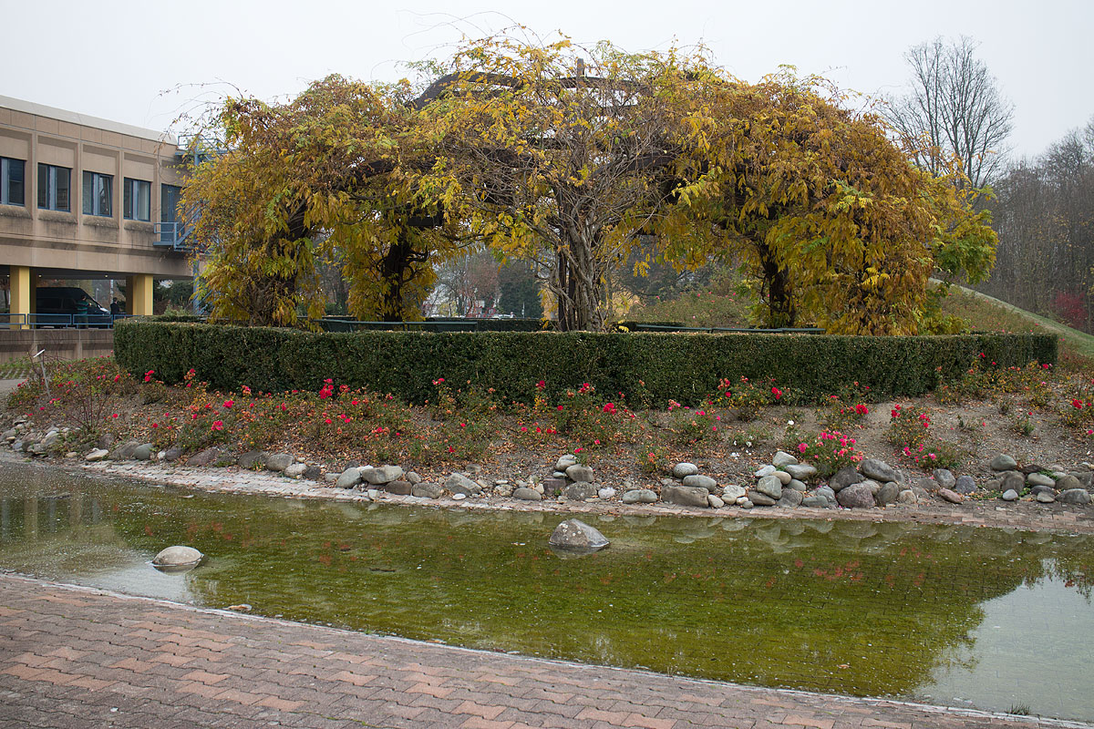 Am verlängerten Ostende der Winterschattenlinie steht leicht erhöht, von mit Rosen bepflanzten Hügeln umgeben, die Rosenkapelle, eine mit Kletterpflanzen bewachsene, domartig überdeckende Stahlkonstruktion, das «Symbol der Lebensfreude». Der grosse Weiher umfliesst, von der Winterschattenlinie (Sonnenwende) abweichend, etwa ein Viertel der Rosenkapelle, verschwindet durch eine Röhre unter der Feuerwehrstrasse und stürzt unter der ausschwingenden Betonplatte stufenweise über versetzt gruppierte Stahlbecken in den Innenhof Süd hinunter.