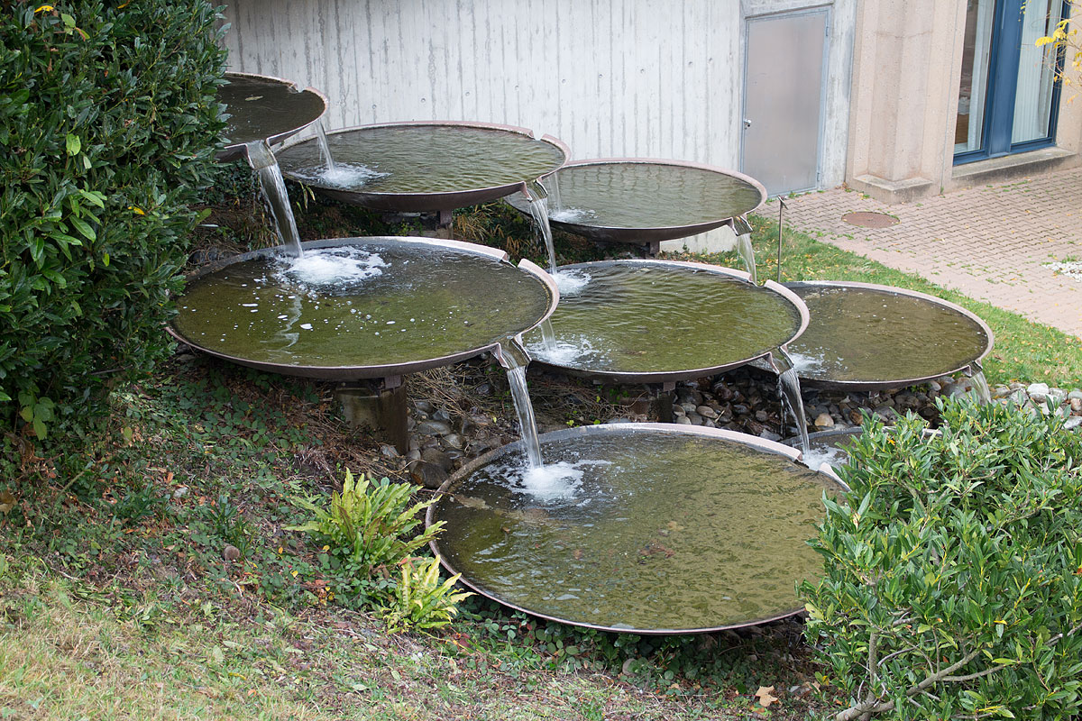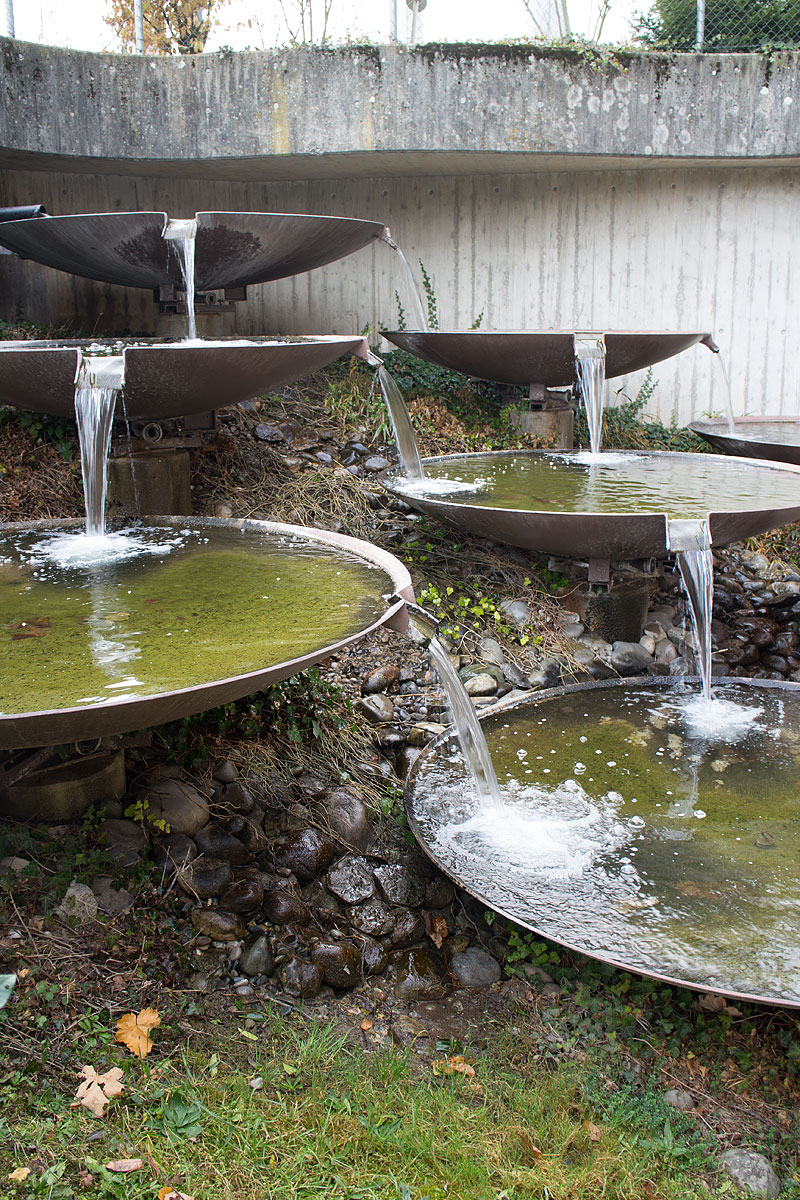 Diese Zone «Wasserfall» steht als Symbol für Krankheit, Alter und Tod. Das von einem Becken zum anderen springende Wasser umschreibt spitzbogenartige Formen. Ähnliche Formen spriessen nach dem Versickern des Wassers, im vorderen Drittel des Südhofes, links und rechts paarweise wieder als Stahlformen aus dem Boden.