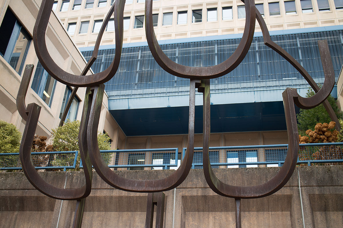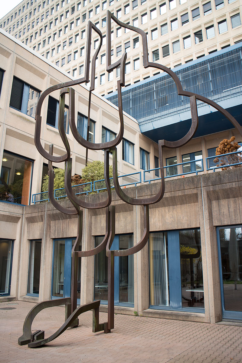 Am tiefen Ende des Südhofes steht «Die Erfüllung», eine vorhangartig aufschwebende Plastik. Dem Wasserfall ähnliche Rhythmen von Stahlformen wachsen aus der Rasenfläche, fächern sich im über-die-Fassaden-auf-steigen nach oben auf und fliessen über zwei Stahlarme, der Silhouette der Wasser- bzw. Rosenkapelle gleichend, auf die Terasse zurück.